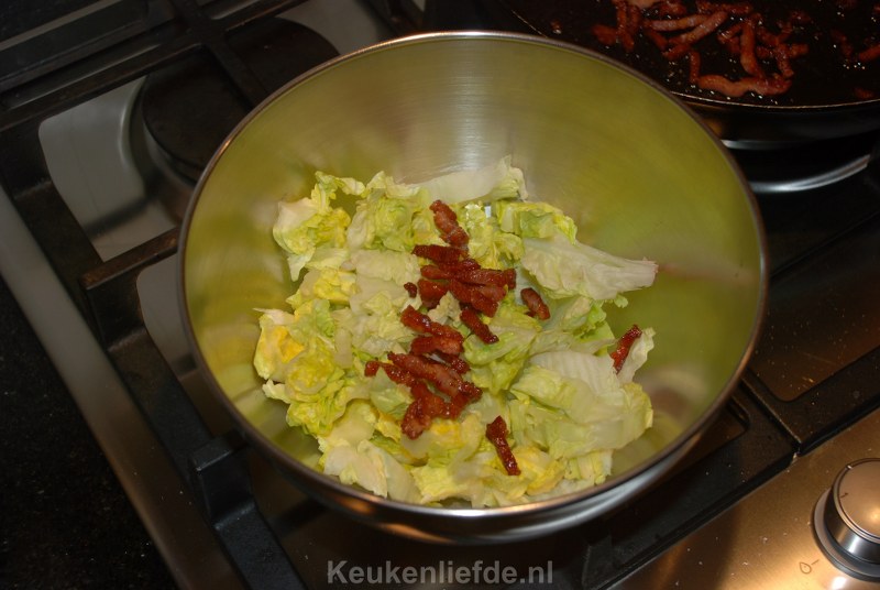 Maak de sla aan met wat olijfolie en schep hier de overige spekjes doorheen.
