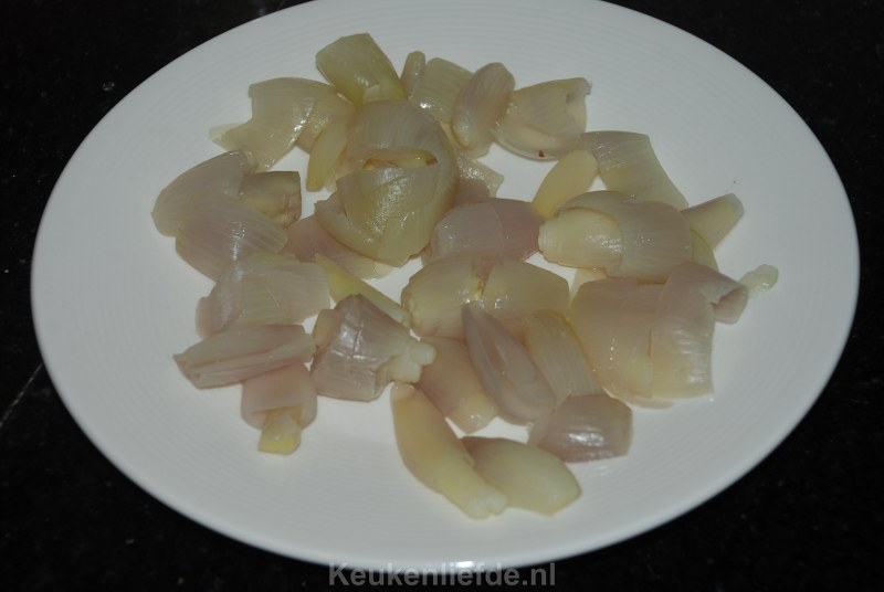 Laat de sjalotten uitlekken in een zeef en halveer ze.