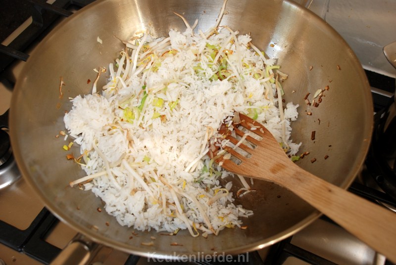 Zet het vuur direct uit zodra de omelet gestold is en bewaar de omelet zolang op een bord. Veeg de wok schoon met een stukje keukenpapier en verhit opnieuw met een scheutje olie. Fruit het sjalotje en knoflook totdat ze zacht zijn op laag vuur. Voeg dan de witte kool en prei toe en zet het vuur hoger. Bak totdat ze zacht zijn. Voeg tenslotte de taugé en de rijst toe en roerbak alles totdat de rijst door en door warm is.
