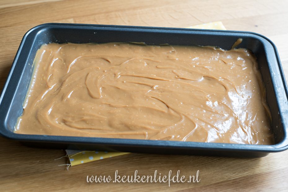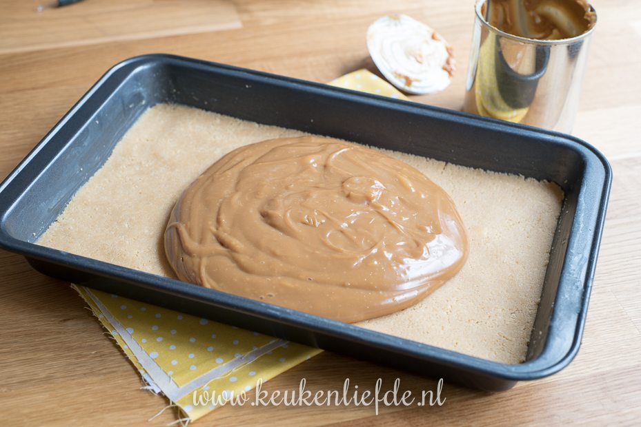 Verdeel de dulce de leche over de koekbodem en strijk glad.