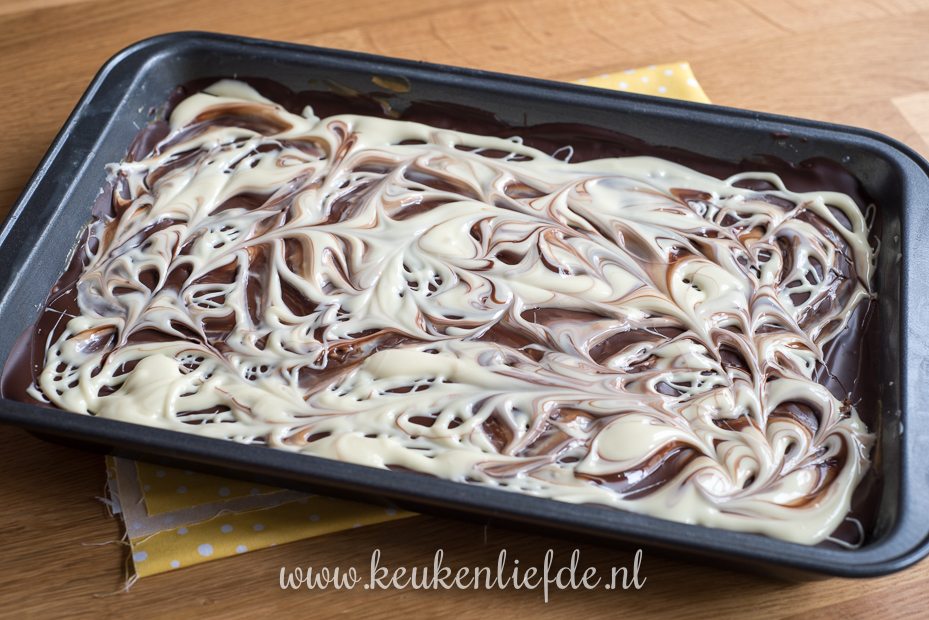 Hak of breek de pure en witte chocolade in kleine stukjes en smelt ze in een aparte kom au bain-marie, of in een magnetronbestendig plastic bakje in de magnetron. Verdeel de pure chocolade over de dulce de leche en strijk glad. Verdeel met een lepel de witte chocolade erover en roer met de punt van de lepel door de witte chocolade om een mooi marmereffect te krijgen.
