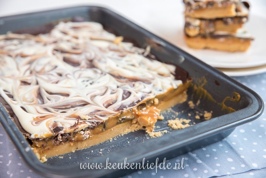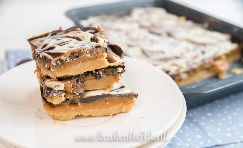 Millionaire’s shortbread stond al tijden op mijn nog-te-maken-lijst. Het is een heerlijke koek, die je qua smaak kunt vergelijken met Twix. Kenmerkend zijn de kruimelige koekbodem, zachte karamelvulling en knapperig chocolade laagje. Ik maakte een eigen variant met een supersnelle bodem van gemalen spritskoekjes die opstijft in de koelkast. Je hebt voor dit recept dus geen oven nodig. Het resultaat is verrukkelijk!