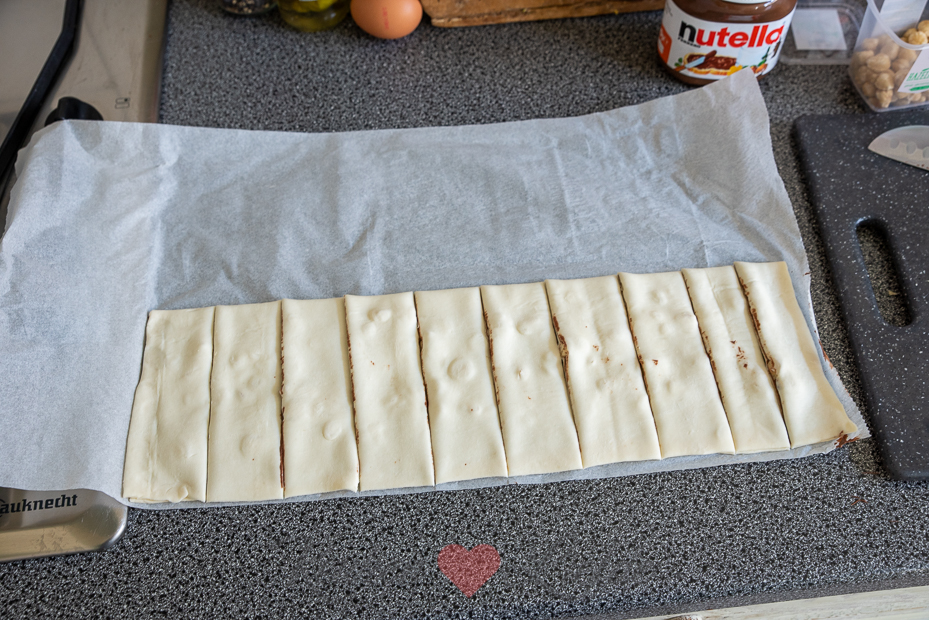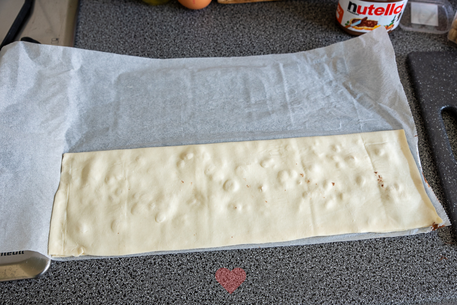 Rol het bladerdeeg uit op een aanrechtblad, laat liggen op het bijbehorende bakpapier. Bestrijk de onderste helft van het bladerdeeg met een laag Nutella en bestrooi met hazelnoten (houd wat hazelnoten achter om over de bovenkant te strooien).