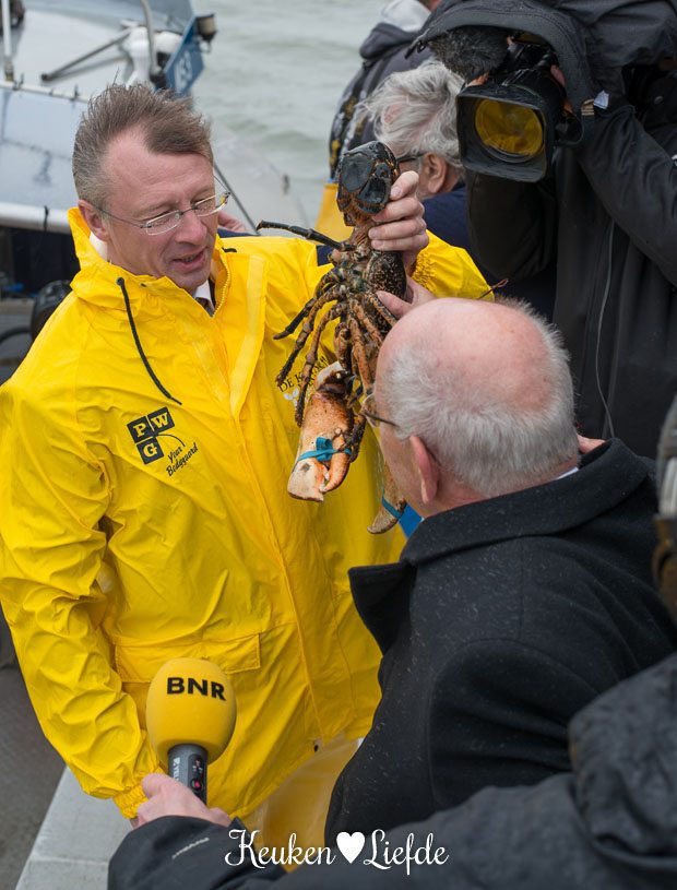 Even later neemt Gerrit Zalm de eerste kreeft in ontvangst.