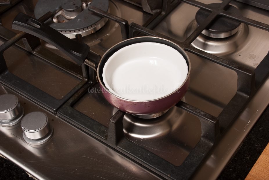 Om te voorkomen dat de bacon omhoog gaat krullen, kun je er een hittebestendig schaaltje opzetten.