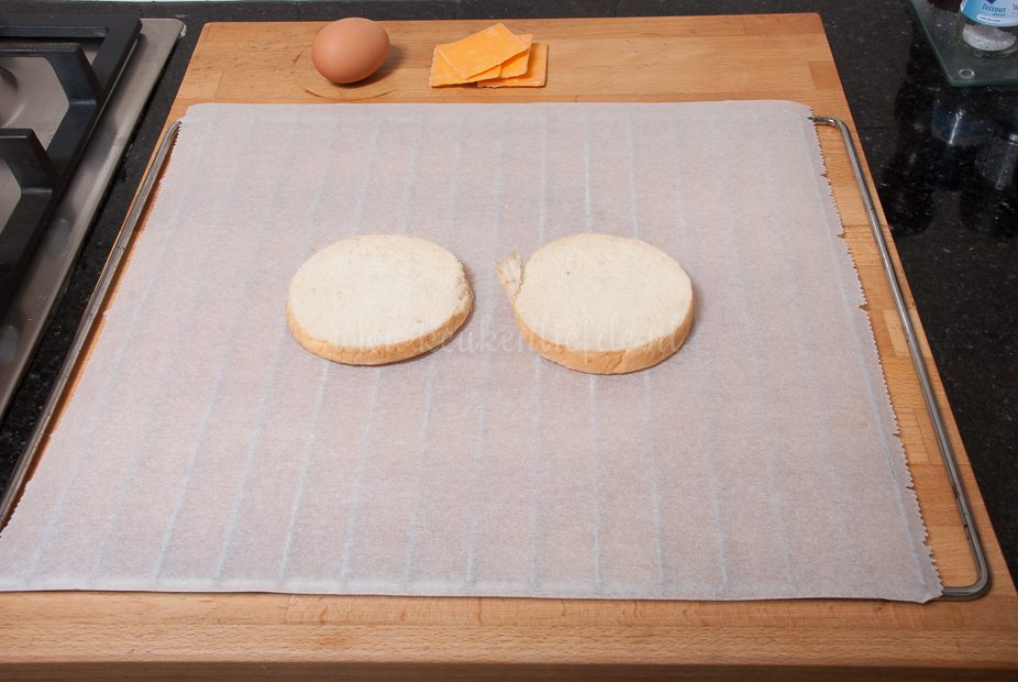 Leg de bacon en het ei op de beschuitbol met kaas en dek af met de andere helft.