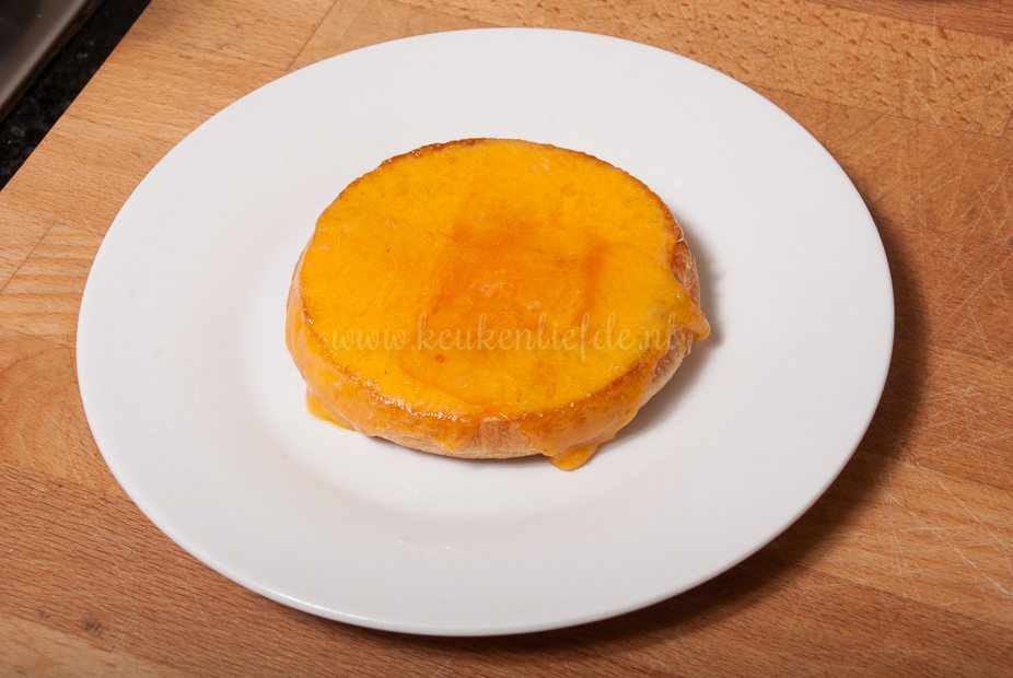 Snijd de beschuitbol doormidden en rooster even kort onder de grill. Leg na 1 minuut de kaas op de onderste helft van de beschuitbol en laat iets smelten.