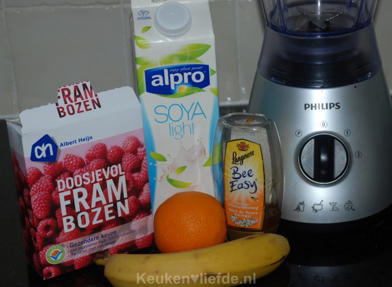Ontbijtsmoothie met banaan, frambozen en sinaasappel