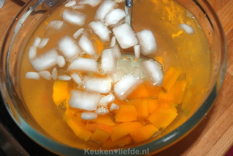 Was de spruitjes en laat ze goed uitlekken. Verwijder het harde gedeelte aan de onderkant en eventueel de bruine blaadjes. Was de pompoen, snijd doormidden en verwijder de pitten aan de binnenkant. Je hoeft de pompoen voor dit gerecht niet te schillen. Snijd de pompoen in stukken, ongeveer even groot als de spruitjes. Breng een pan met water en een beetje zout aan de kook. Zet een grote kom met ijswater (water en ijsblokken) klaar. Voeg de spruiten toe aan het kokende water en kook ze ongeveer een minuut.