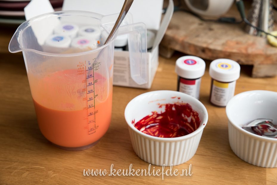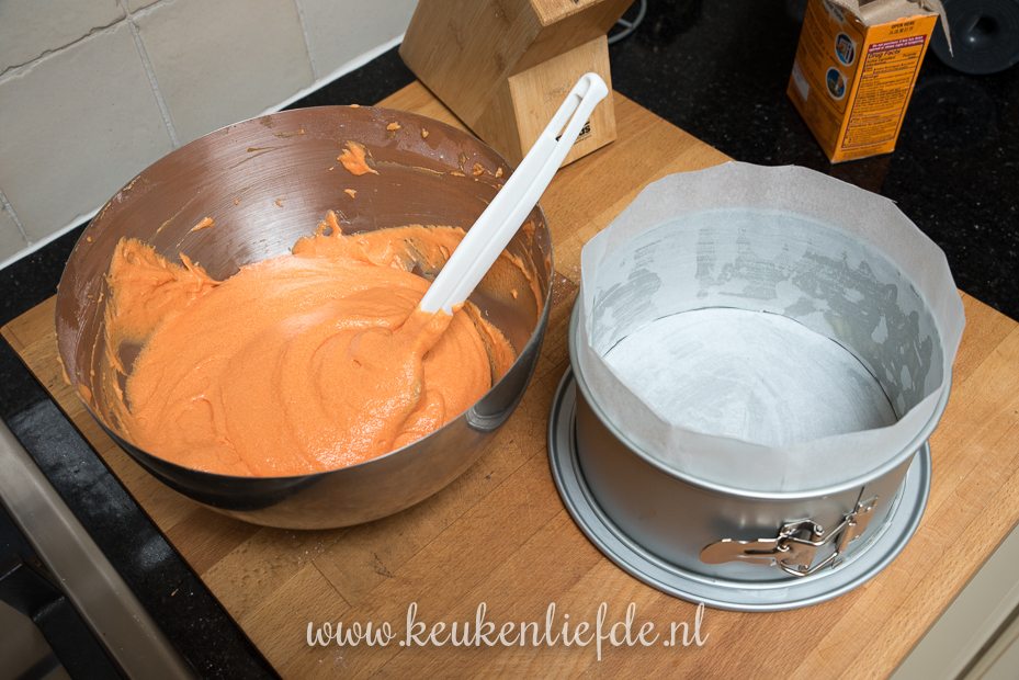 Als cakebasis gebruik ik dit red velvet cake recept van Menno. Deze cake is luchtig, zacht en smeuig. Kortom, geweldig! Om de taart oranje te kleuren gebruik ik levensmiddelenkleurstof. Die kun je online bestellen in speciale online bakwinkels. Ik heb trouwens alleen primaire kleurstoffen, dus oranje heb ik zelf gemaakt van rood en geel.