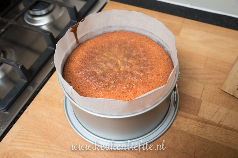 Laat de cake 30 minuten in de vorm afkoelen en verwijder dan de rand. Laat volledig afkoelen.
