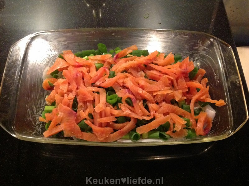 Doe de kabeljauw in de ovenschaal die je met boter hebt ingevet. Bestrooi met peper en zout. Voeg de in stukjes gesneden bosui eroverheen. Verdeel vervolgens de gerookte zalm in snippers erover.