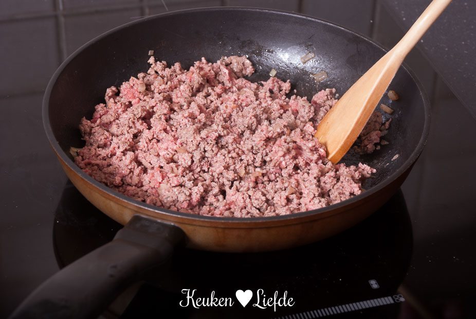 Verwarm de oven voor op 200 graden. Pel de ui. Snijd de ene helft van de ui in smalle ringen, snipper de andere helft fijn. Pers de knoflook uit. Snijd de paprika’s in kleine blokjes. Snijd de champignons in plakjes. Verhit de koekenpan met 1 theelepel Lurpak en fruit de gesnipperde ui, de helft van de knoflook, paprikapoeder en tijm, totdat de ui zacht is. Voeg het gehakt toe en bak rul. Breng op smaak met peper en zout. Schep het gehakt uit de pan en laat uitlekken in een zeef.