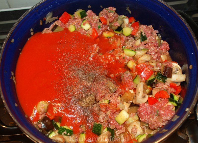 Aubergine neemt veel vocht op, dus voeg indien nodig wat extra olijfolie toe om te voorkomen dat de aubergine droog wordt of aanbakt. Breng goed op smaak met zout en peper. Voeg dan de paprika en courgette toe en bak weer enkele minuten verder. Breng weer op smaak met zout en peper.