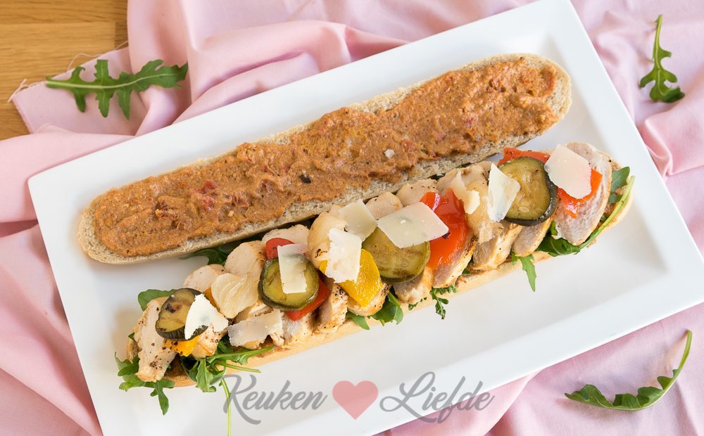 Snijd de panini open en besmeer beide helften royaal met pesto. Beleg de onderste helft van de panini met rucola. Snijd de kipfilet in plakken en verdeel over de rucola. Laat de gegrilde groenten uit het potje uitlekken en verdeel over de kip. Schaaf wat parmezaan over de kip en groenten en bedek met de bovenste panini.