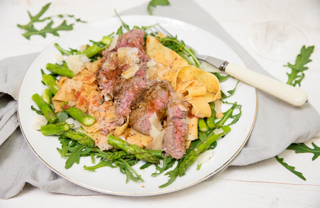 Verdeel de rucola over twee borden en verdeel de pappardelle erover. Leg de gesneden biefstuk en groene asperges op de pasta en garneer met wat Parmezaan. Druppel eventueel nog wat olijfolie over de pasta en draai er wat zwarte peper uit de molen overheen.