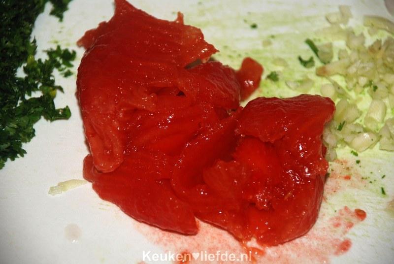Schep ze uit de pan en trek het vel eraf. Snijd met een mesje de aanzet onderaan de tomaat eruit en knijp met je handen (boven de spoelbak) de tomaten leeg zodat al het vocht en zaad uit de tomaten is. Hak de tomaten fijn.