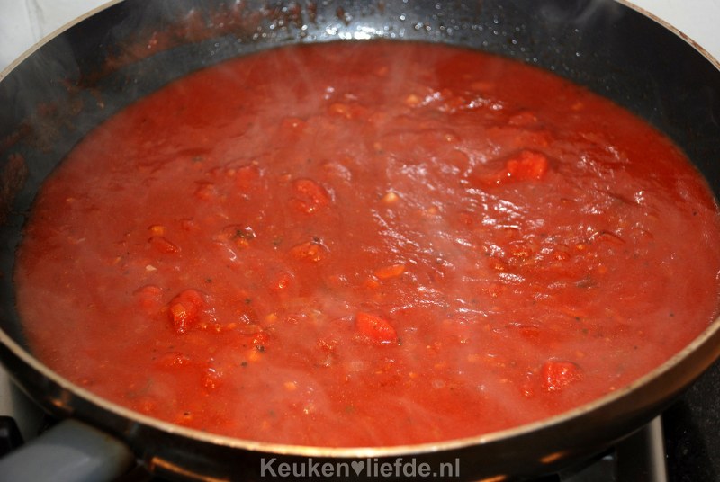 Voeg de gezeefde en verse tomaten toe aan de ui en breng de saus op smaak met zout, peper en een snufje suiker. Laat de saus op laag vuur zachtjes pruttelen.