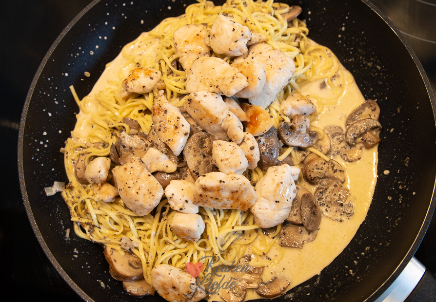 Pasta met truffel, champignons en kip. Een heerlijk pastagerecht met romige truffelsaus, gebakken champignons en kip. Makkelijk om te maken en klaar in 15 minuten!
