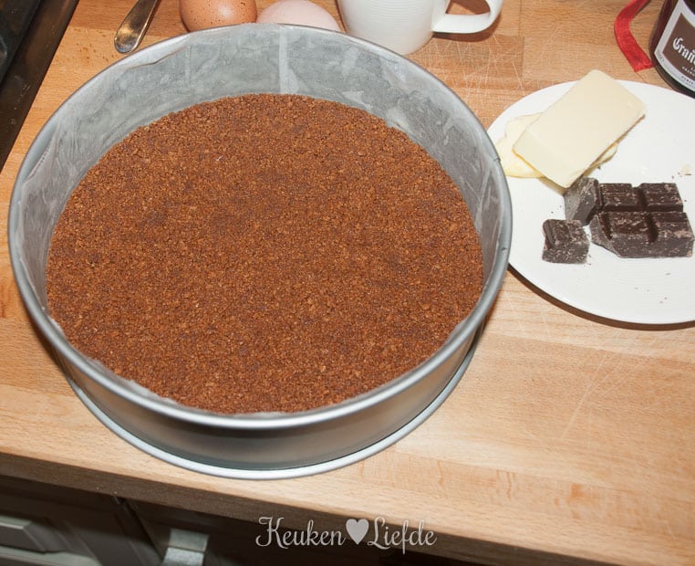 Verdeel de pepernotenkruimels over de bodem en druk aan met de bolle kant van een lepel.