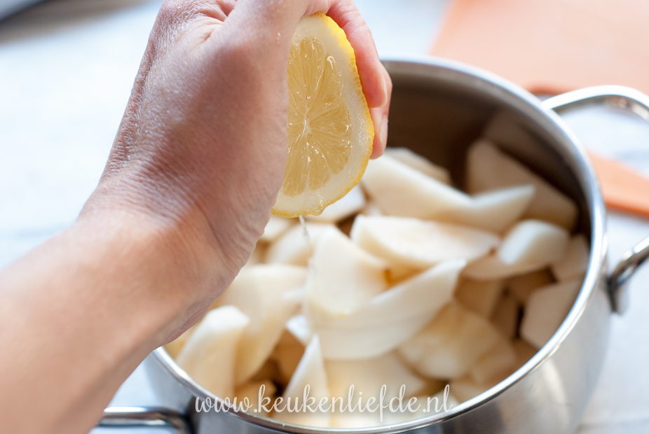 Om de perenjam wat fijner te maken kun je de perenstukjes fijnstampen met een pureestamper. Het is niet erg als er nog wat stukjes peer zichtbaar blijven, dat is juist lekker.