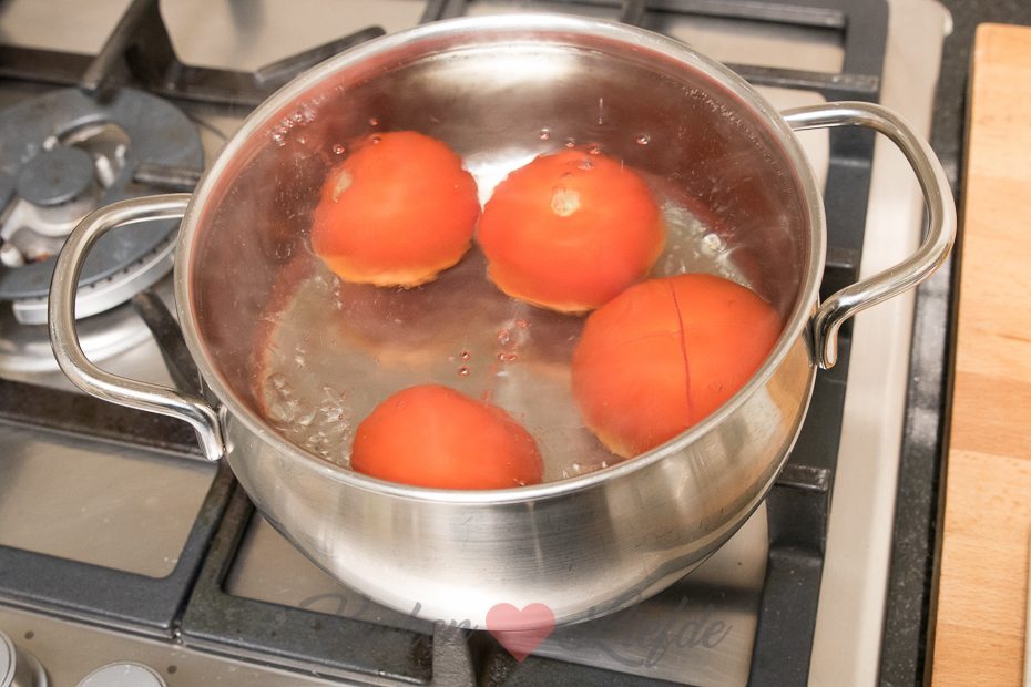 Kruis de tomaten aan de bovenkant in en dompel ze onder in een pan met kokend water. Laat ze enkele seconden liggen (niet te lang, want dan worden de tomaten melig), totdat je het tomatenvelletje makkelijk los kunt trekken. Trek het tomatenvel eraf en verwijder het sap en zaadlijsten uit de tomaten. Snijd het vruchtvlees in kleine blokjes.