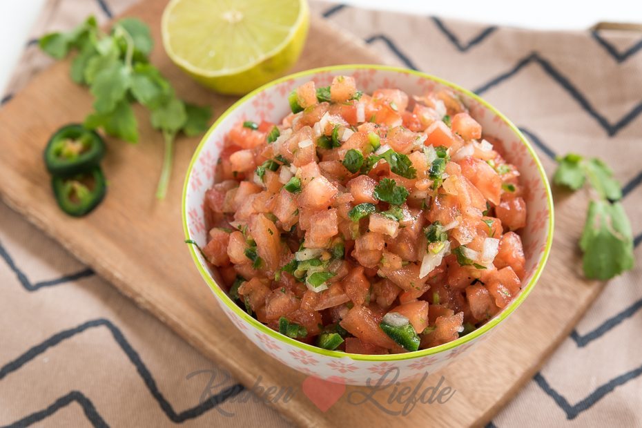 Meng de tomatenblokjes in een kom met de overige ingrediënten (gebruik zoveel jalapeño als je zelf lekker vindt) en breng op smaak met zout en peper.