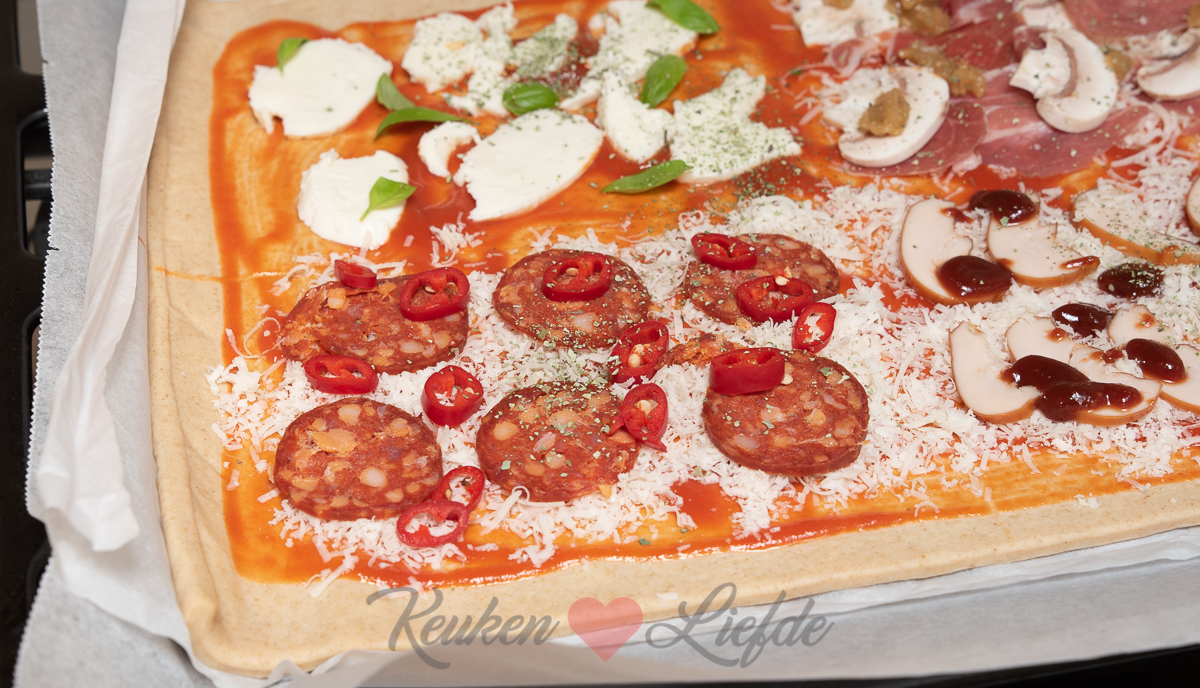 Beleg de pizza in 4 smaken met de verschillende toppings. Begin altijd eerst met de kaas en dan de overige ingrediënten. Bestrooi de pizza met wat gedroogde oregano.