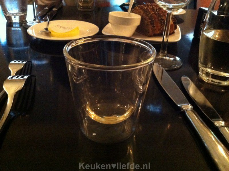 ’s Middags om 14.30 uur nemen we plaats aan tafel in Brasserie Lourens, het restaurant van Post-Plaza. Omdat de brasserie normaal op zondag gesloten is, hadden we de prachtige zaal, compleet met openhaard, kroonluchters en schitterende plafondornamenten, voor ons alleen. In deze sfeervolle ambiance werden ons drie amuses voorgezet: een bouillon met tomaat en champagne, een ijshoorntje gevuld met olijvenjam en olijvenijs – erg bijzonder! –, en een knolselderijmousse met een crumble van roggebrood. Stuk voor stuk heerlijke mondvermaakjes!