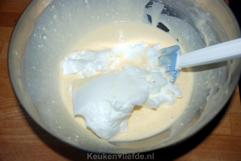 Splits de eieren. Klop de eidooiers met de helft van de suiker en zout tot een lichtbleek en romig mengsel. Klop het eiwit, totdat het wat steviger wordt en het wit kleurt en voeg dan al kloppend de overige helft van de suiker toe. Klop verder tot stijve witte pieken. Zeef de bloem boven het eidooiermengsel en spatel het er om en om met de slagroom en melk doorheen. Spatel tot slot, beetje bij beetje, luchtig het eiwit door het beslag.