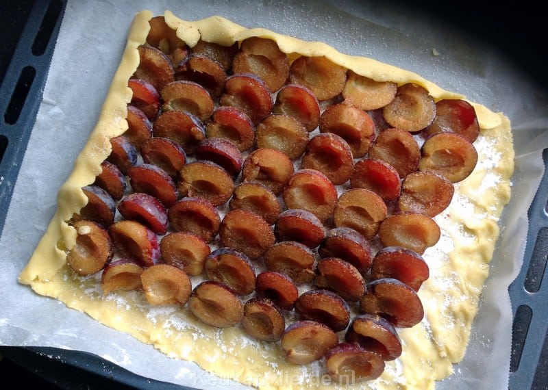 Verdeel de pruimen (met de schil naar beneden) in rijen over de bodem, de randen vrijlaten.