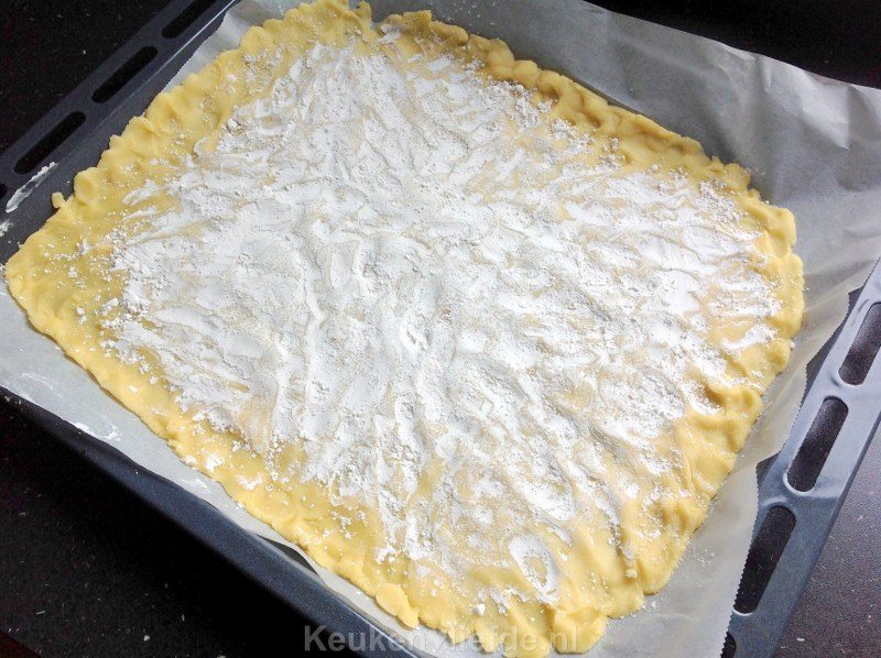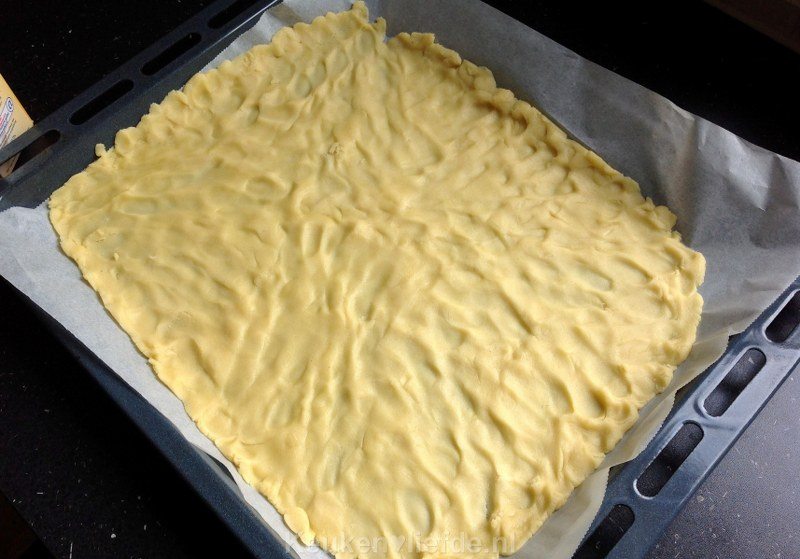 Verwarm de oven voor op 180 graden. Bekleed het bakblik met bakpapier. Rol circa 2/3 van het deeg uit op een met bloem bestoven werkblad, tot een ovaalvormige lap iets kleiner dan het bakblik. Leg de bodem voorzichtig op het bakblik. Ik had natuurlijk weer geen geduld om het deeg te laten rusten en drukte het deeg op het bakblik, met mijn vingertoppen uit.