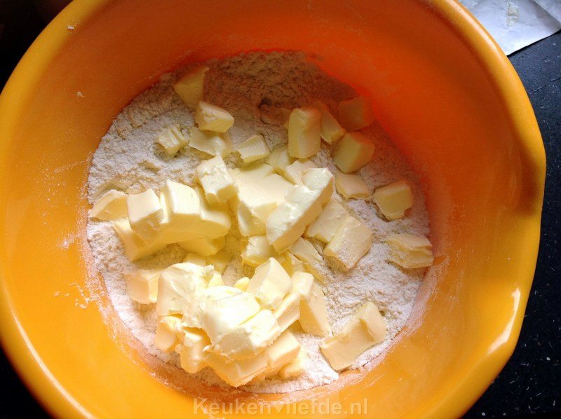 Roer de bloem, suiker en zout door elkaar en voeg de boter toe.