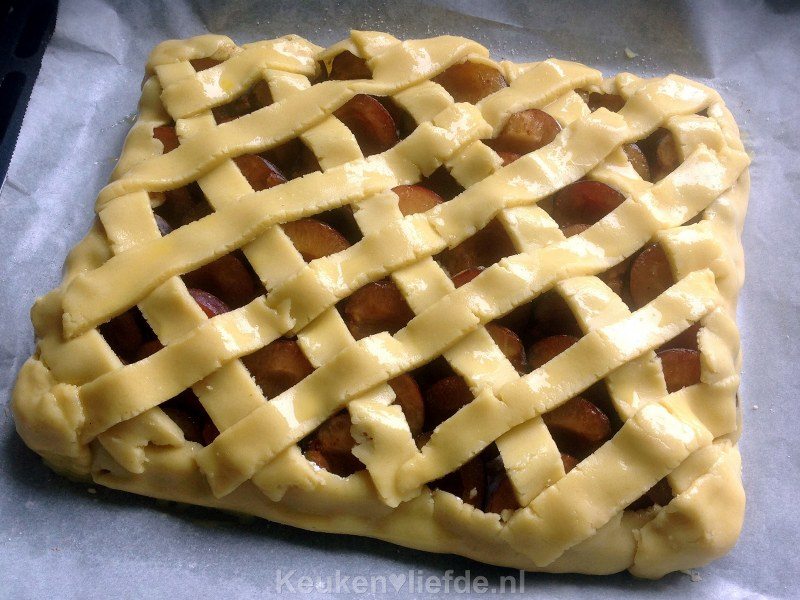 Bestrooi de pruimen met vanillesuiker en kaneelpoeder en vouw dan de randen deeg met behulp van het bakpapier over de pruimen. Rol het overige deeg uit tot een lange lap en snijd hier repen van. Leg deze kruislings over de pruimen. Klop het andere ei los en bestrijk het deeg hiermee.