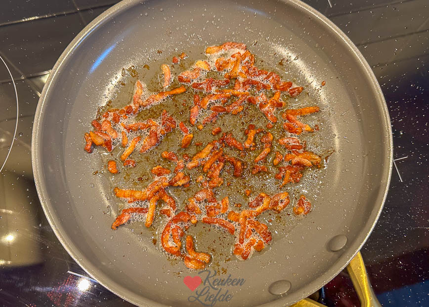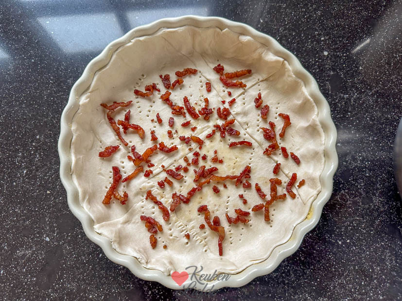 Ik bestrooi de quiche met geraspte gruyére maar die hoort er eigenlijk niet in. Toch vind ik het een lekkere toevoeging. Ook is het lekker om gesneden ui of prei met de spekjes mee te bakken. Eigenlijk kun je met quiche alle kanten op. Maar ik houd hem dit keer zo dicht mogelijk bij het origineel.