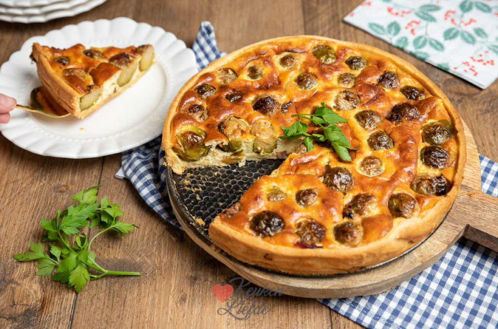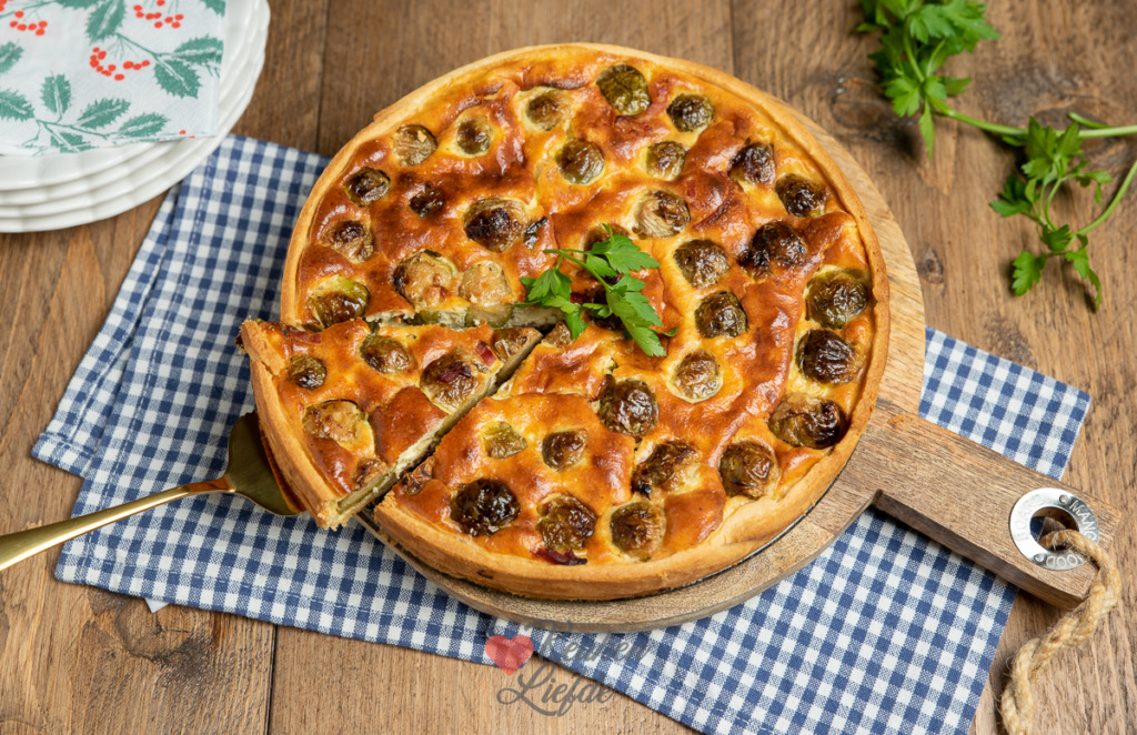 Een heerlijke quiche met spruitjes en spekjes. De spruitjes en spekjes worden eerst geroosterd in de oven en gaan daarna in de quiche. Je hebt voor dit recept dus alleen een oven nodig. De spruitjes krijgen door het roosteren in de oven een heerlijke smaak! Ik serveer deze quiche graag als hoofdgerecht met een lekkere salade erbij. Bijvoorbeeld deze salade met witlof, appel en geitenkaas.