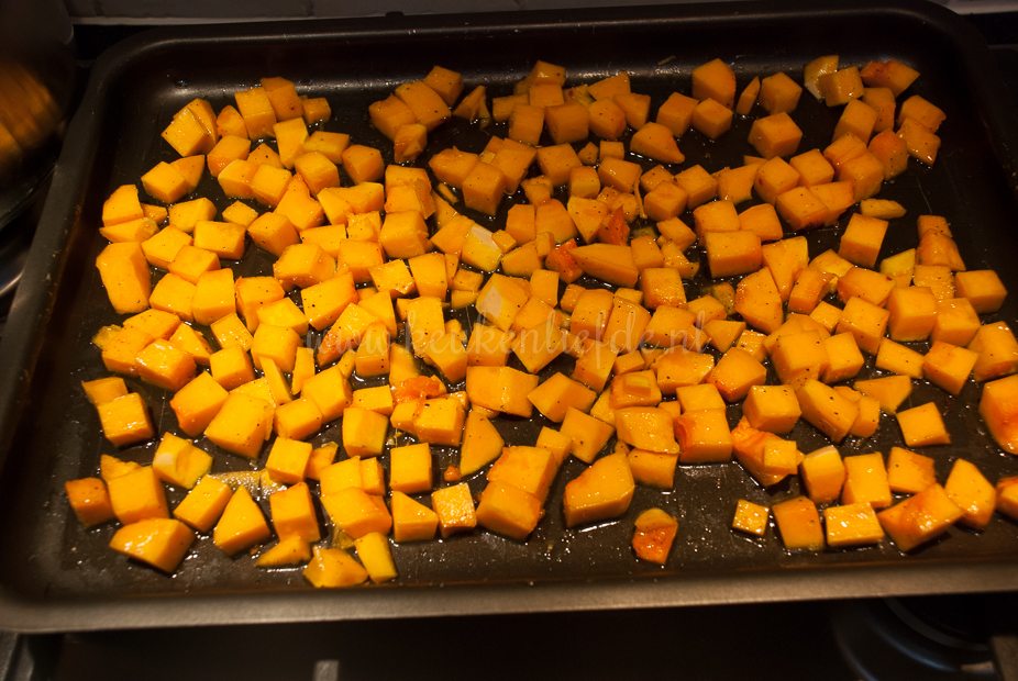 - 1/2 flespompoen, geschild en in kleine blokjes gesneden (je kunt ook 400 g kant-en-klaar gesneden pompoenblokjes gebruiken uit het koelvak van de supermarkt)
