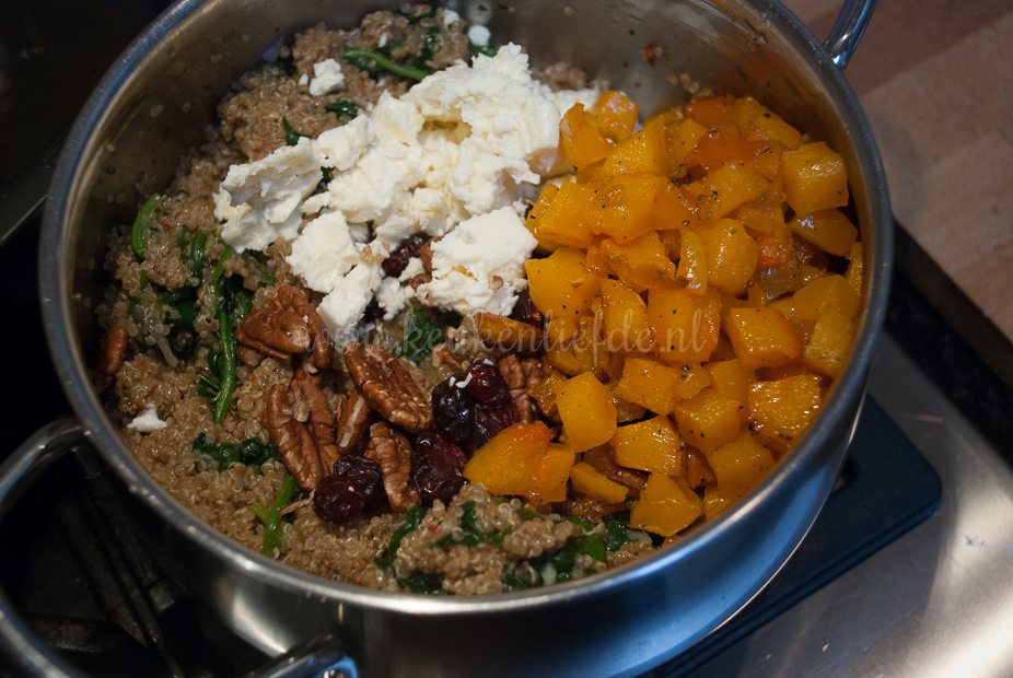 Giet de quinoa af en meng met de pompoen, spinazie, feta, pecannoten en cranberry’s. Breng op smaak met peper en zout en eventueel een extra scheut olijfolie.