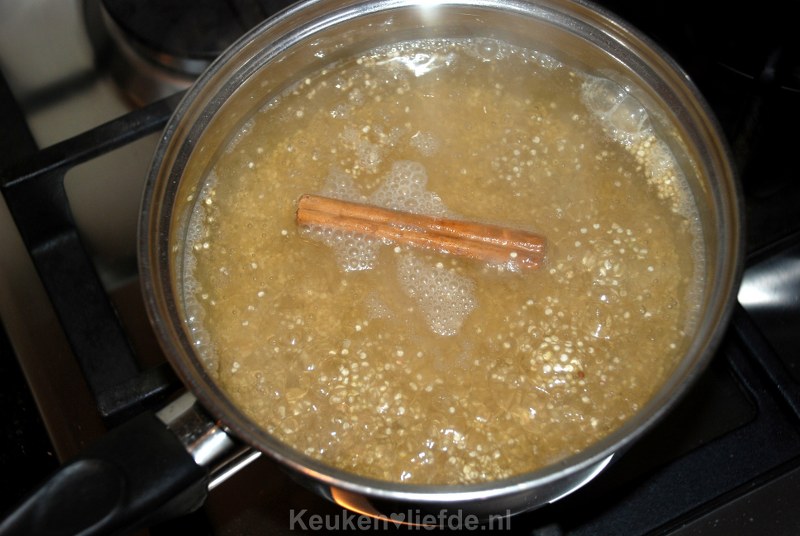 Breng een pannetje water aan de kook en voeg 1 kopje quinoa toe, het kaneelstokje en een handje rozijnen toe.