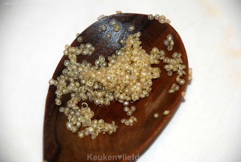 Kook ongeveer 12 minuten of totdat de quinoa gaar is (er komt een vliesje om de quinoa heen).