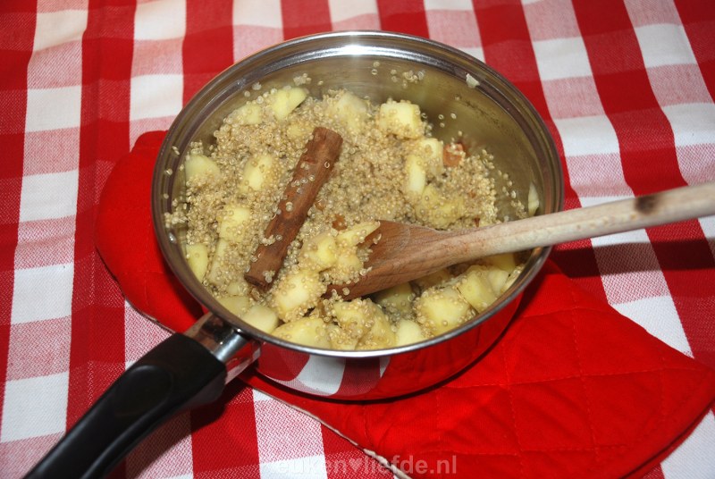 Voeg de laatste 5 minuten van de kooktijd de appel toe aan quinoa en kook mee.