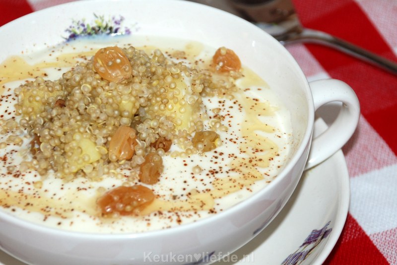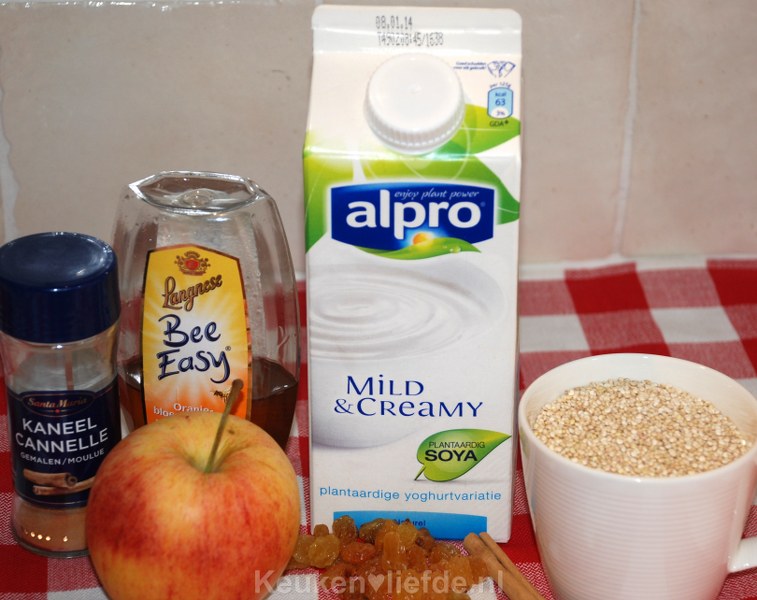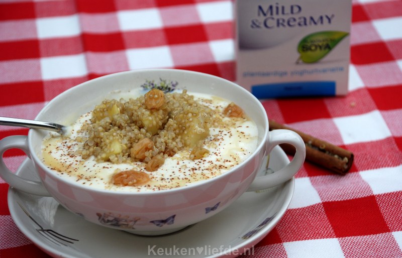 Schenk wat Alpro Mild & Creamy in een kommetje en schep er wat quinoa overheen. Bestrooi met wat kaneelpoeder en honing.