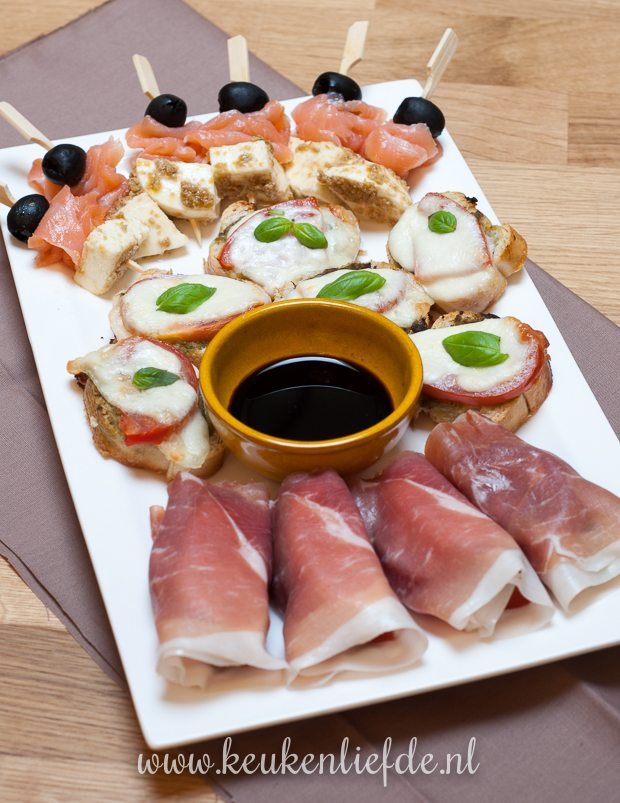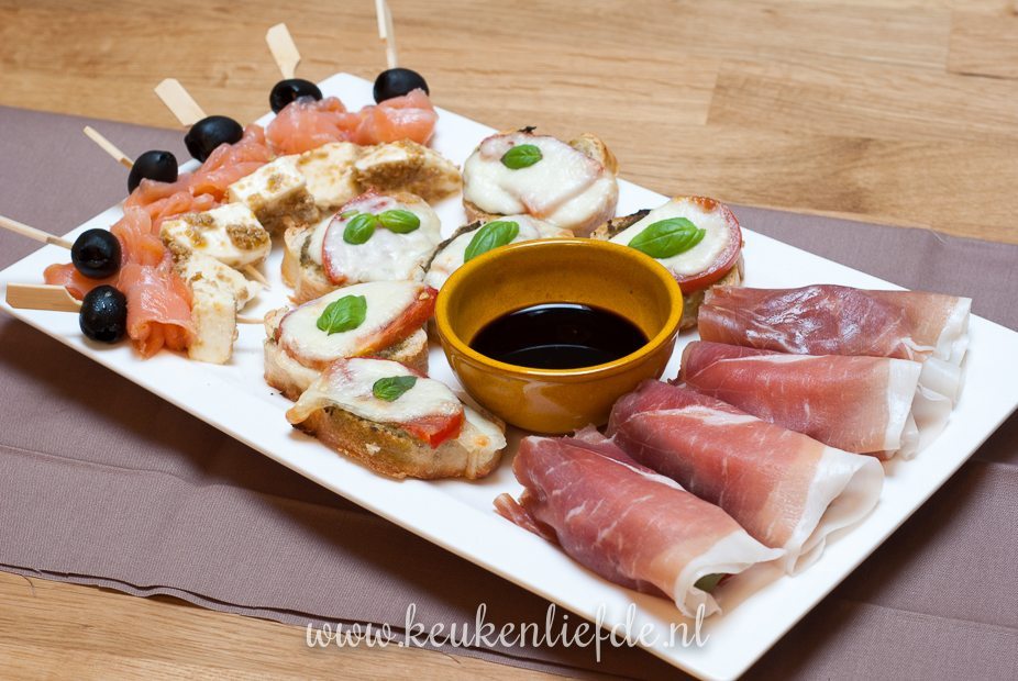 Mozzarella in blokjes snijden en marineren in pesto, of olijventapenade. Om en om met reepjes gerookte zalm en olijven aan spiesjes rijgen.