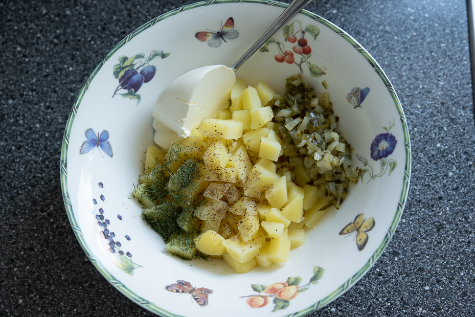 Meng de aardappels in een kom met de overige ingrediënten — bepaal de hoeveelheid crème fraîche naar eigen smaak — en breng op smaak met zout en peper uit de molen.