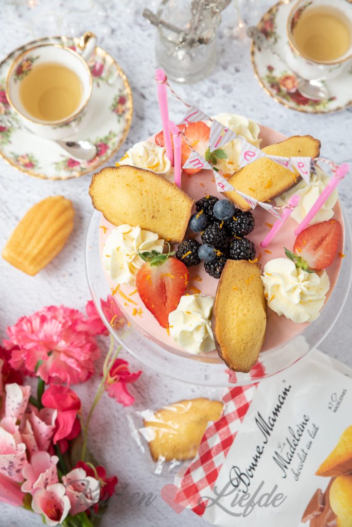 Zet de vlaggetjeslijn bovenop de taart. Klop de slagroom stijf met de vanillesuiker en doe in een spuitzak met stervormige spuitmond. Garneer de taart vlak voor serveren met toeven slagroom, gehalveerde aardbeien (laat het kroontje zitten, dat ziet er leuk uit), bramen en blauwe bessen en chocolade madeleines. Rasp tot slot wat sinaasappelschil over de taart.