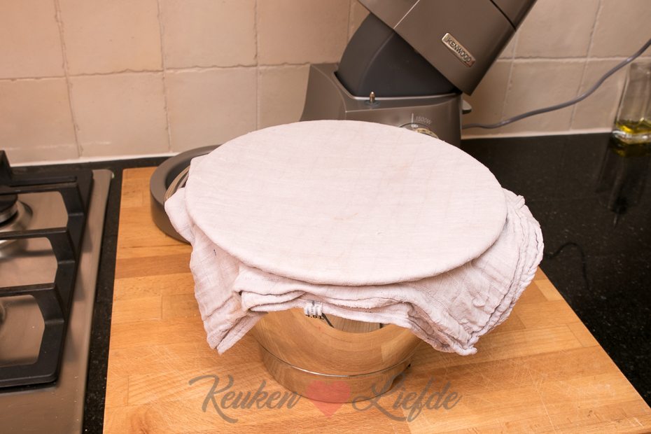 Dek het deeg in de kom af met een vochtige theedoek (ik trek altijd een elastiek om de rand, zodat de kom goed is afgesloten) en laat op een warme plek (ik gebruik de rijsstand in de oven) 30 minuten rijzen, totdat hij in volume verdubbeld is.