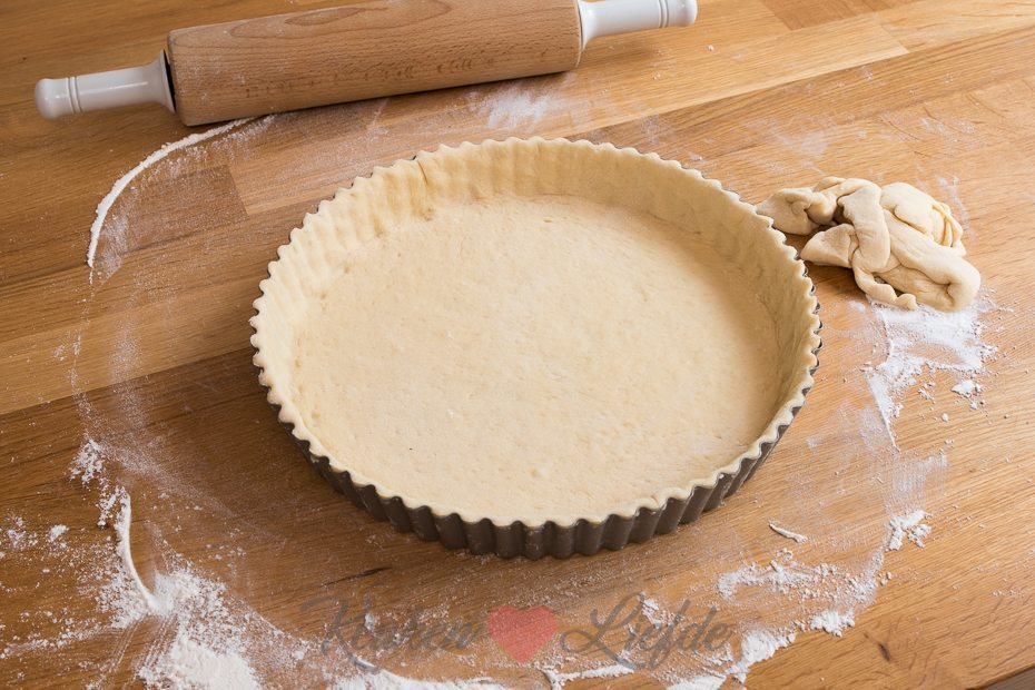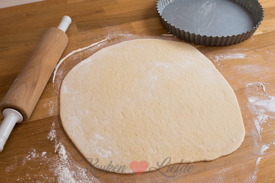 Duw met je vuist de lucht uit het deeg. Rol hem, op een met bloem bestoven aanrecht, uit tot een lap die iets groter is dan de vlaaivorm. Leg de deeglap voorzichtig in de springvorm en druk het deeg goed in de randen. Snijd het overtollige deeg aan de bovenkant eraf. Dek met een vochtige theedoek losjes af en zet opzij.