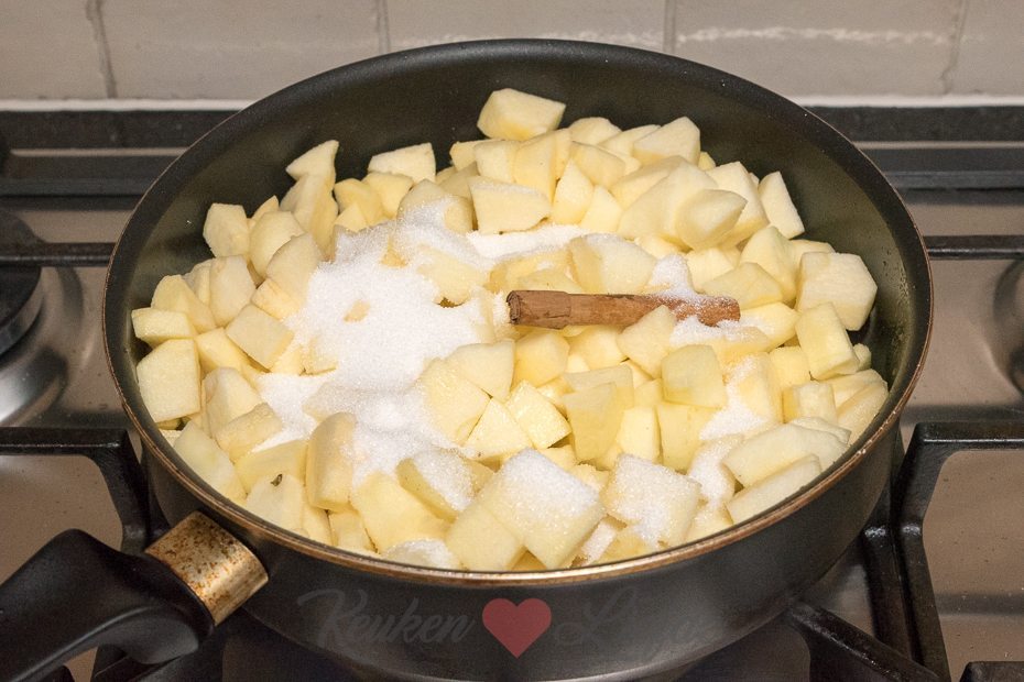 Schil de appels en snijd ze in blokjes. Smelt de boter in een ruime pan en voeg de appel, suiker en het kaneelstokje toe. Bak de appels op middelhoog vuur circa 8 minuten, totdat ze zacht zijn en het meeste vocht verdampt is. Verwijder het kaneelstokje en roer de uitgelekte rumrozijnen en maizena erdoor. Giet de vulling in een schaal en laat afkoelen.