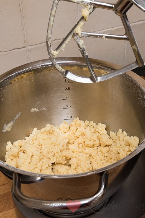Bevestig de K-klopper op de Chef Titanium. Doe de bloem, suiker en boter in de kom en mix op middelhoge stand, totdat je kruimels hebt. Duw af en toe met een mes de vastgeplakte boter aan de K-klopper terug in de kom.