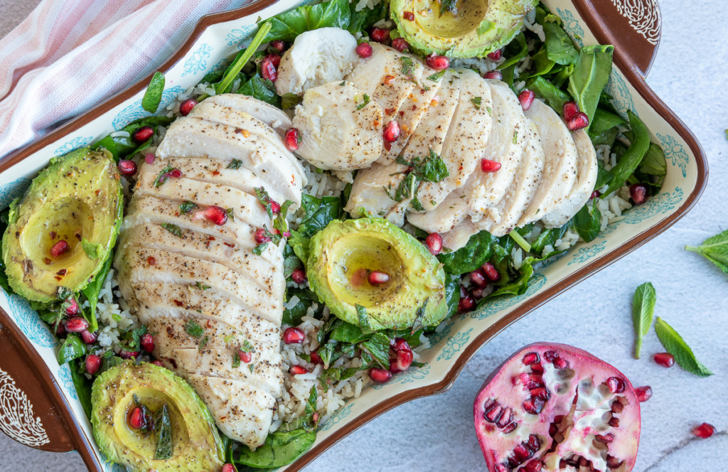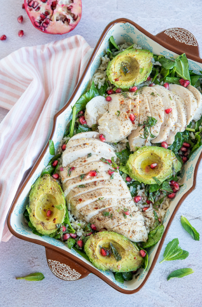 Deze kipsalade uit de oven met avocado, granaatappel en zilvervliesrijst komt uit het kookboek De makkelijke bakplaat van Rukmini Iyer. Het is tevens het coverrecept en bij de eerste blik op de foto wist ik, die wil ik maken. Ik ben een echte ovenkoker dus haar bakplaatboeken zijn op mijn lijf geschreven. Bovendien zijn haar recepten altijd makkelijk om te maken en hebben ze vaak een verrassende twist. Eerder deelde ik hier ook al een sinaasappelcake met hazelnoten uit haar kookboek De zoete bakplaat. De kipsalade met avocado, spinazie en zilvervliesrijst is heerlijk fris van smaak door de dressing met limoen, munt en granaatappelpitjes. De chilivlokken geven een aangename warmte. Je kunt deze kipsalade eten als hoofdgerecht, maar ik vond hem de volgende dag koud als lunch ook heerlijk. De avocado wordt in dit recept gegaard in de oven en ik kan daar nog steeds niet helemaal aan wennen. De textuur blijft nagenoeg hetzelfde maar de smaak veranderd iets. Ik vind avocado lekkerder als hij niet gebakken is, maar het is leuk om eens uit te proberen. Probeer het zelf en laat me weten wat je ervan vindt. Ik ben heel benieuwd!
